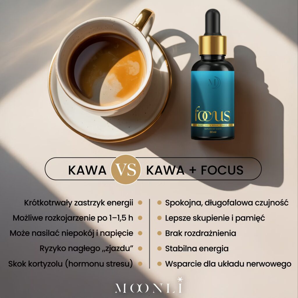 Kawa i adaptogeny mogą działać razem i to z zaskakująco dobrym efektem. Kofeina daje szybki zastrzyk energii, ale kończący się zjazdem szybciej, niż zdążysz powiedzieć „americana”. Krople Moonli Focus nie konkurują z kawą, tylko ją uzupełniają, łagodząc to, co w niej bywa trudne do przełknięcia: nerwowość, rozproszenie, nagłe spadki, czyli pomagają uniknąć jej negatywnych skutków.